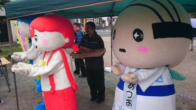 函南町さんのお友達「かんちゃん」「なみちゃん」と一緒にお客さんにお饅頭配布したあつ!