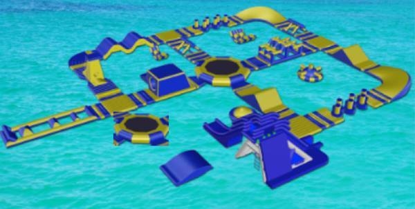 海上遊具の素材はゴム。滑り台、跳躍器具、トンネル、飛び石といった26種類のアトラクション。設置場所は、サンビーチ北側(熱海ビーチライン側)の一区画です。