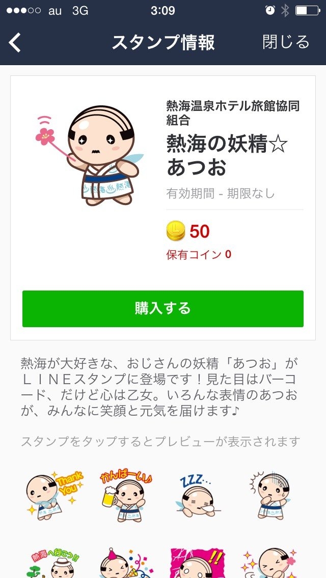 スタンプショップ→左上の虫眼鏡を押して”あつお”を検索→購入