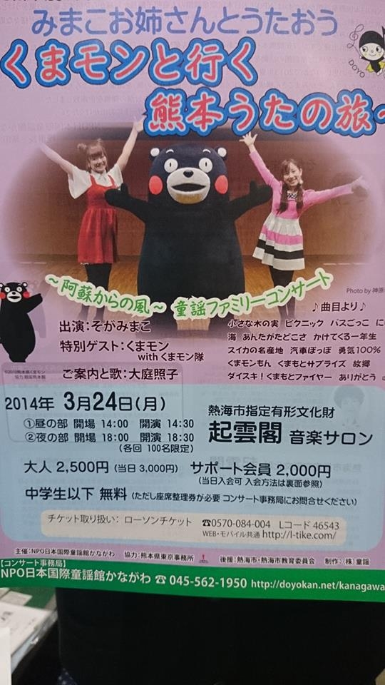 本日、熱海市起雲閣にくまもんが来ます!熊本うたの旅ということで、14時30分と18時30分の二回公演です。チケットはローソンチケットか、もしくは市内の井上紙店さんで購入可能です。大人2500円、中学生以下無料です。