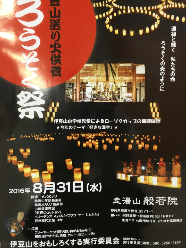 8月31日(水)に、伊豆山をおもしろくする実行委員会主催による「伊豆山送り火供養ろうそく祭」が走湯山般若院にて開催されます。