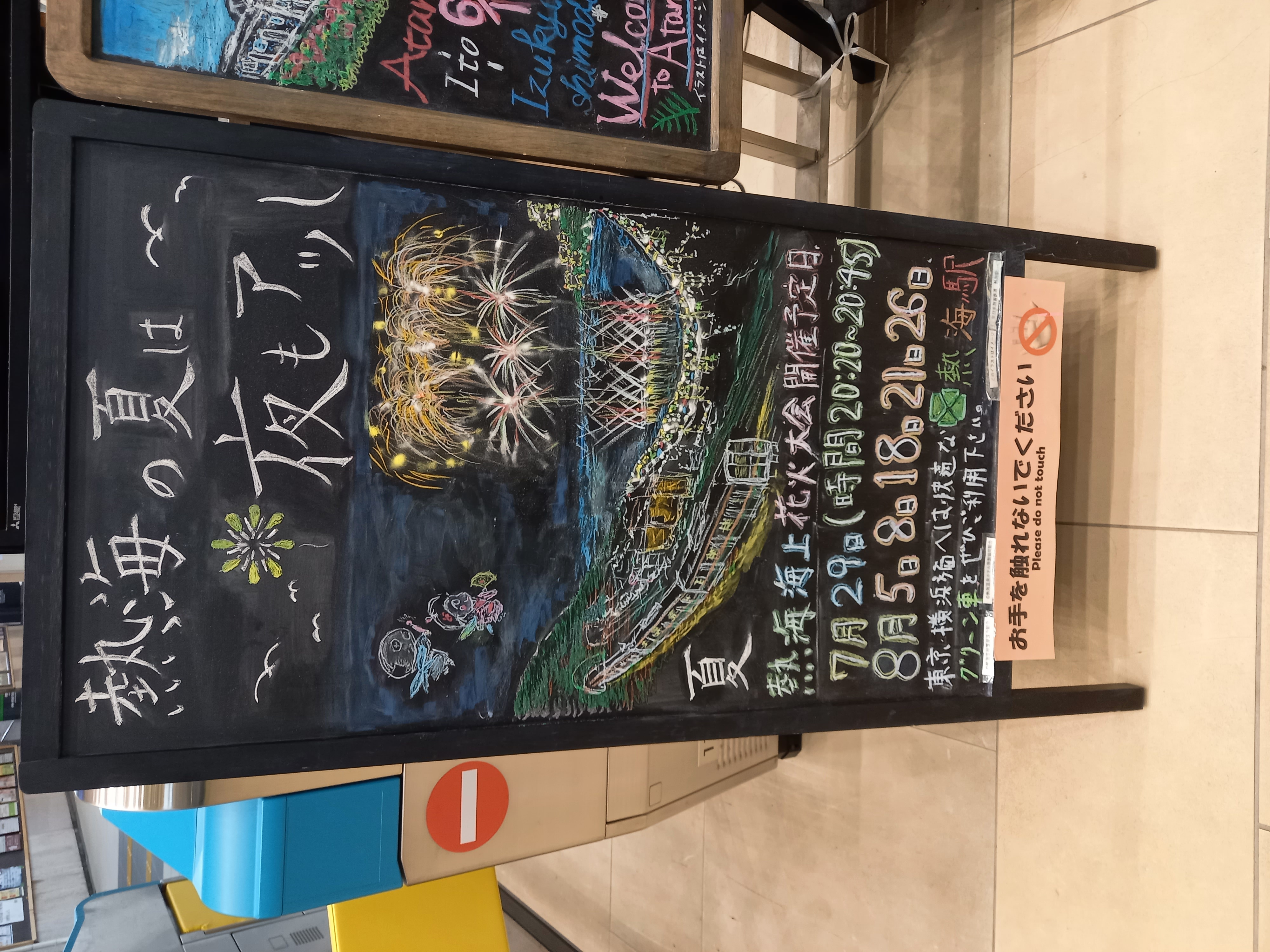 熱海駅の改札口には、あつおとまめっこが花火大会を鑑賞しています。