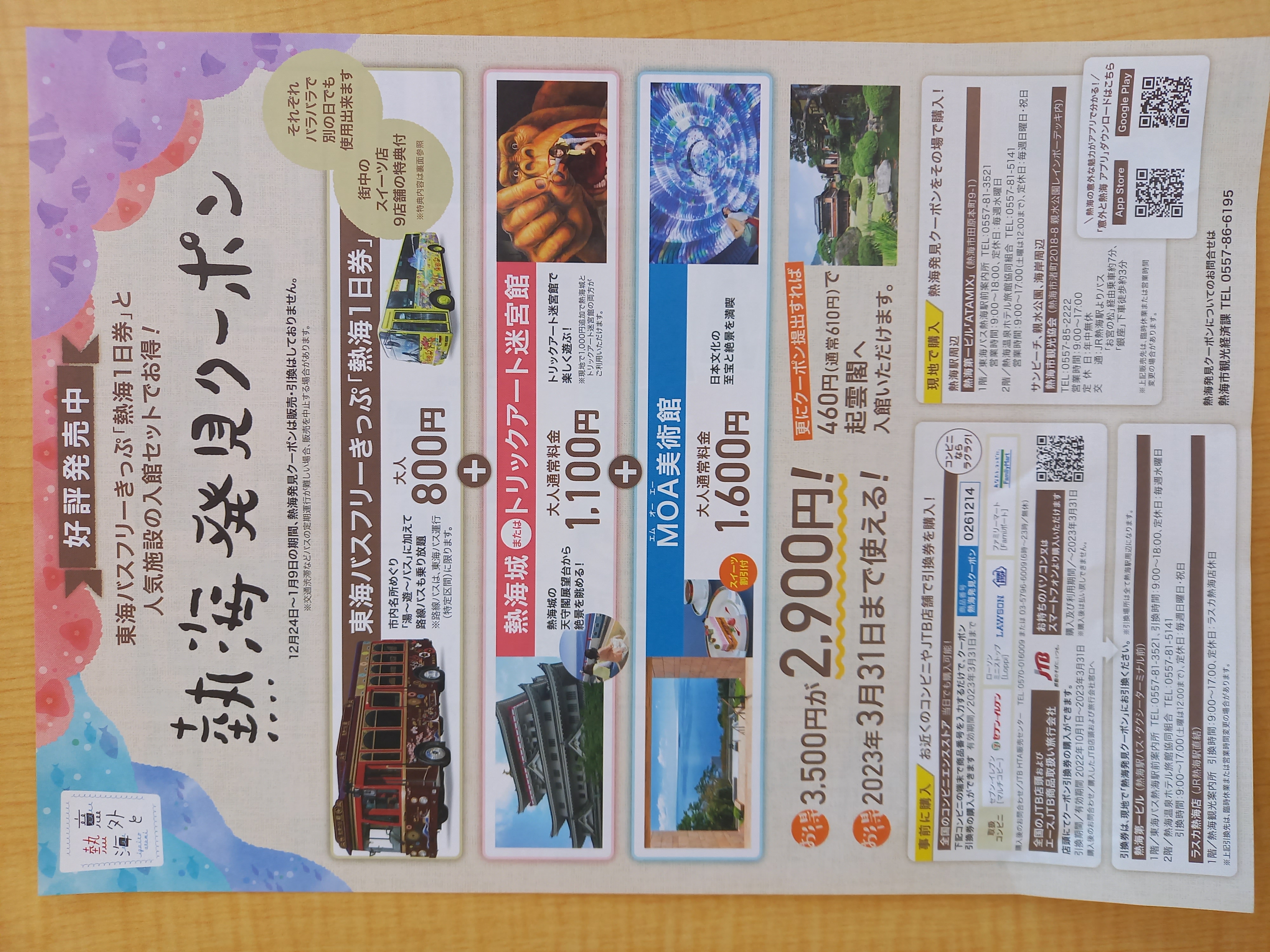 熱海市内の名所を巡る「湯~遊~バス」の1日乗車券や、「熱海城」または「トリックアート迷宮館」の入場券、「MOA美術館」の入場券がセットになっています。