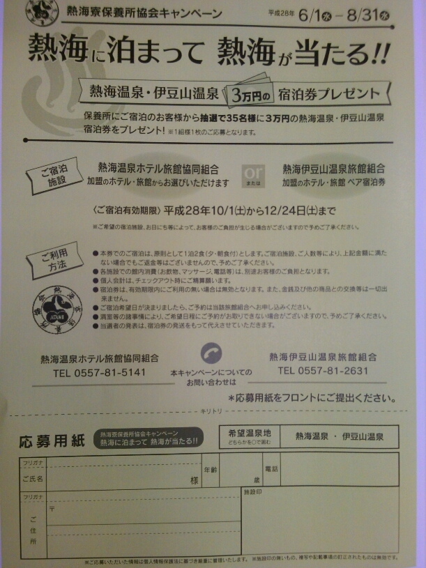 昨年も、実施しました熱海寮保養所協会さんのキャンペーン「熱海に泊まって熱海があたる!」が今年も実施されています。