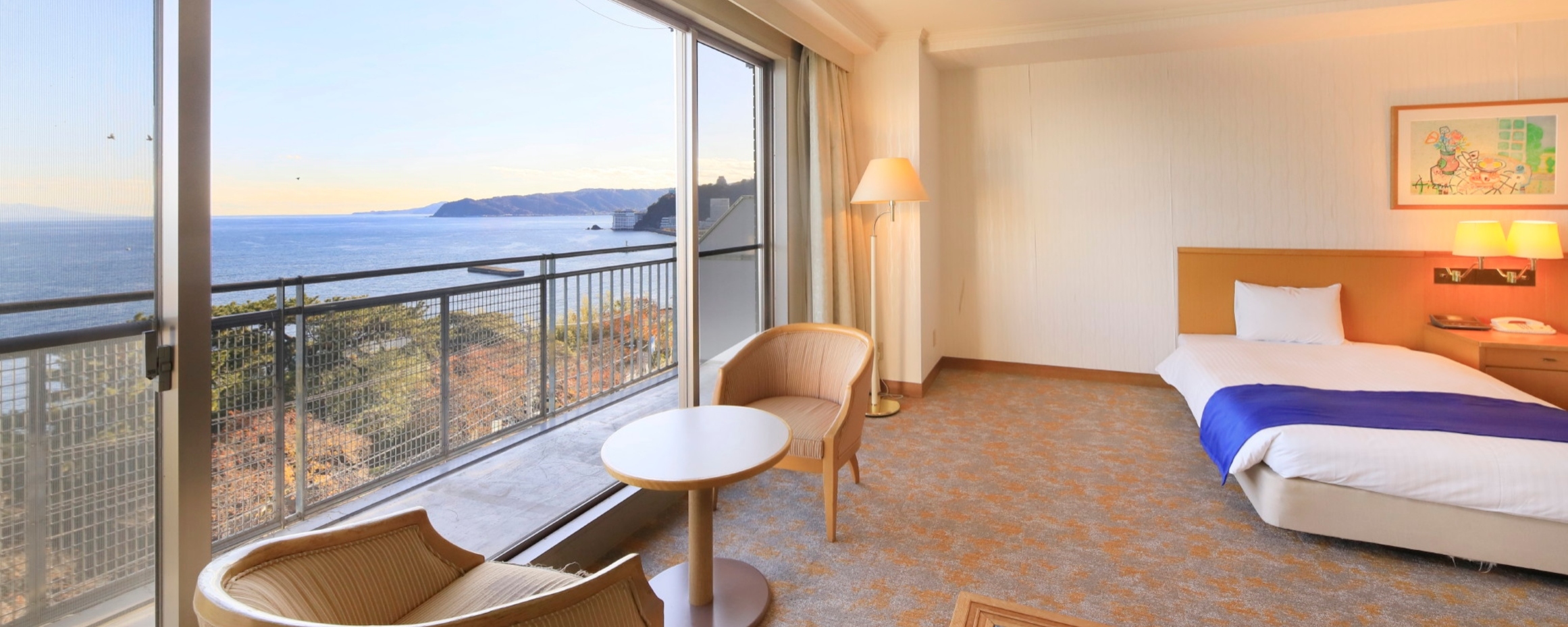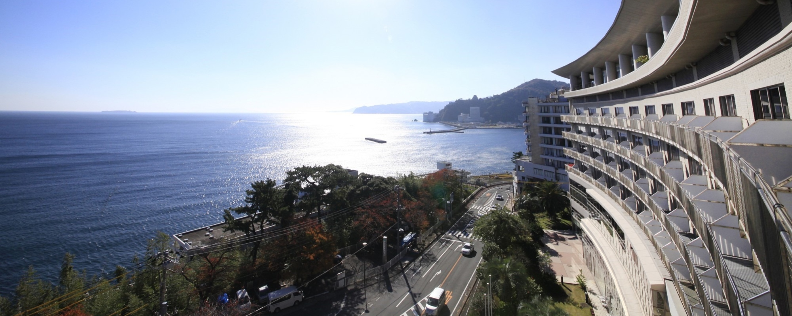 駅から徒歩7分。お部屋は全室オーシャンビュー、初島や大島も一望。敷地内から湧出する源泉かけ流しの露天風呂も大好評。ご夕食は日本料理と中国料理からお選び頂けます。